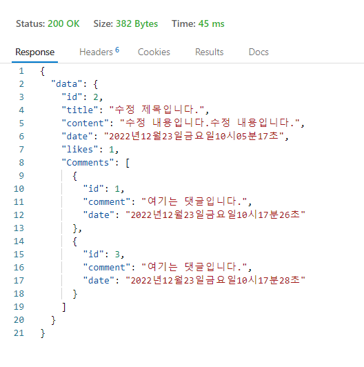 JOIN까지는 정상적으로 작동을 했다 이제 댓글을 최신순으로 뽑아오는게 문제다 처음 시도는 include안에 comment부분에 order를 설정해주는 방식으로 진행했다 하지만 order는 제대로 작동하지 않았다
