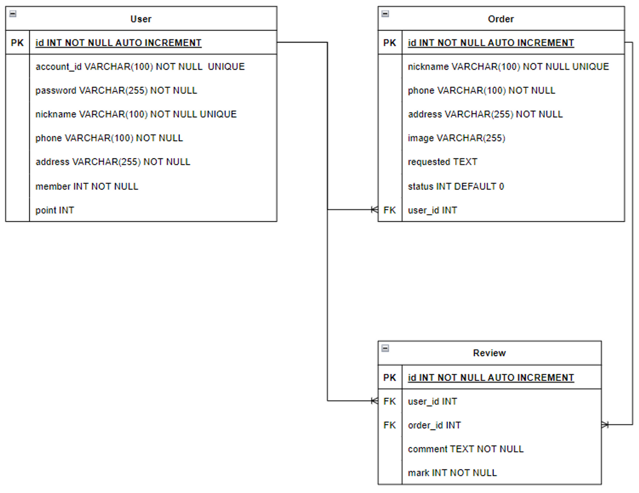 | :user_id 주문 접수 내역 | GET | /api/orders | - | # 200 { image : image, date : date, nickname : nickname, phone : phone, address : address, requested : requested, status : status, comment : comment, mark : mark } |