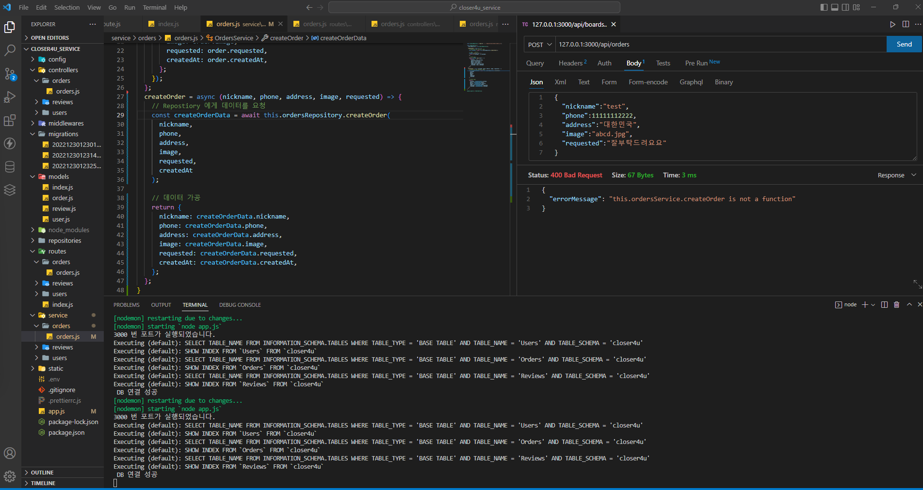 위 코드에서 creatOrder 메서드가 class 밖으로 빠져있는 문제였다 그래서 인스턴스를 만들어도 메서드를 찾지 못하는 간단한 문제여서 금방 해결했다 여기서 배운점은 메서드는 꼭 클래스의 안에 위치하고 있는걸 확인하자