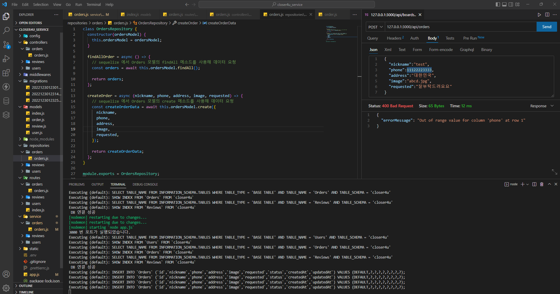 이 문제는 테스트로 핸드폰 번호를 적어넣을때 integer의 범위를 넘어서는 숫자의 값이 들어가서 범위를 초과했다는 에러가 발생하는 거였다 이 문제는 핸드폰 번호를 VARCHAR 형식으로 바꾸면서 문제를 해결했다