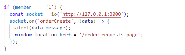 나의 목적은 사장님만 새로운 주문을 실시간으로 확인할 수 있게 해주기 위해서 member가 1 즉 사장님의 member를 가지고 있는 회원만 소켓에 접속하고 실시간으로 정보를 받을 수 있게 만들었다 이렇게 오늘은 socket.io를 이용해서 고객이 주문신청을 하면 실시간으로 사장님이 알림을 받을 수 있게 작업을 진행했다