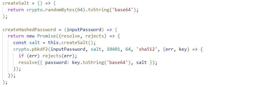 salt를 랜덤으로 만들고 pbkdf2를 이용해서 만든 암호화된 비밀번호와 salt를 반환 받아서 사용하고 싶었다