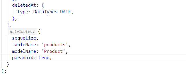 product 모델 파일에 설정을 추가합니다 paranoid 설정을 true로 주어서 deleteAt 컬럼을 사용해 완전히 삭제하지 않고