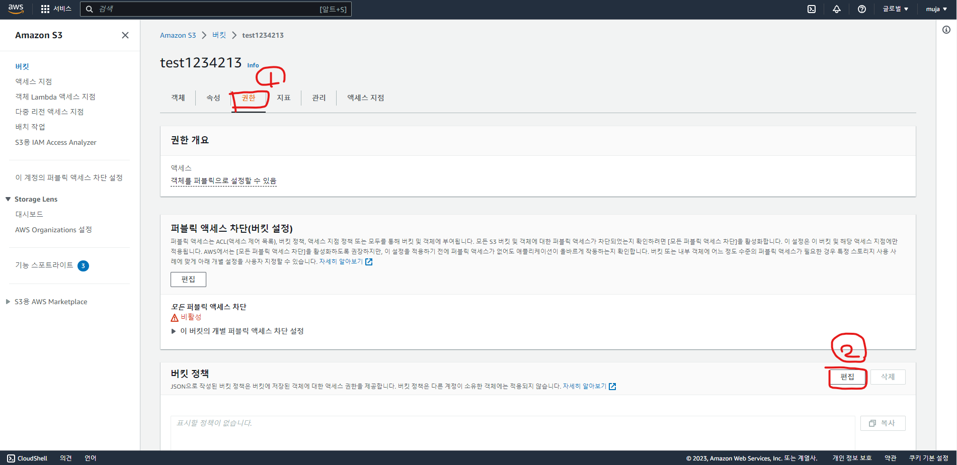 생성한 버킷을 선택하고 권한을 설정해 보자