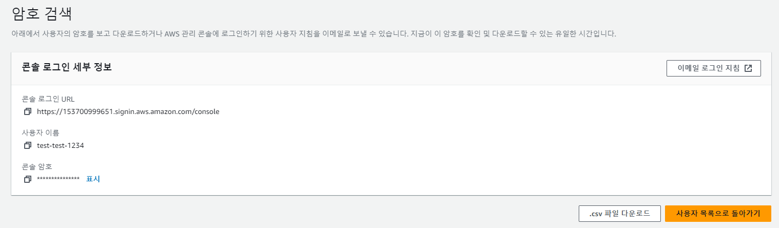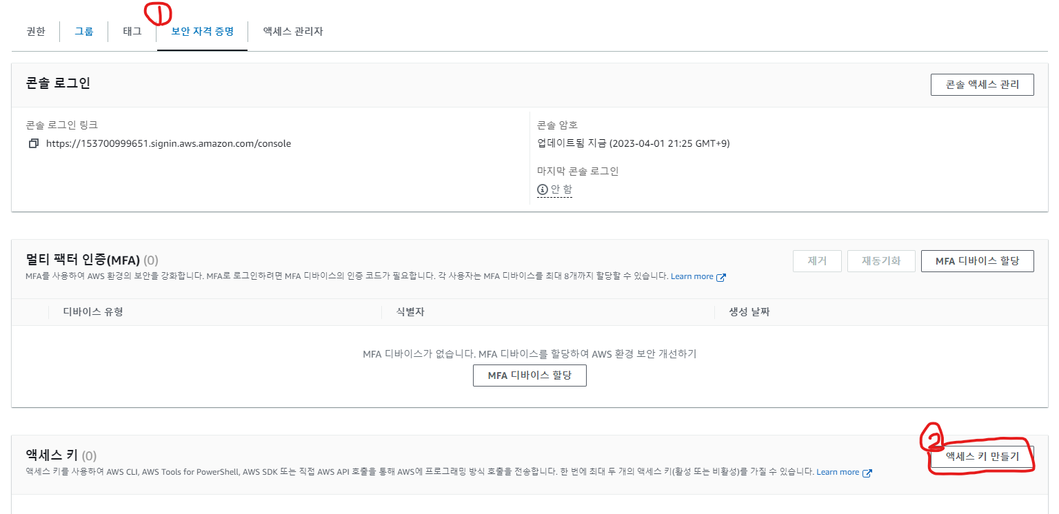 만든 사용자를 선택하고 보안 자격 증명 탭에서 엑세스 키를 만들자