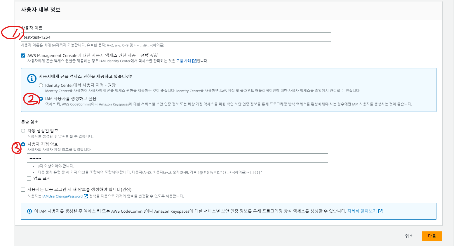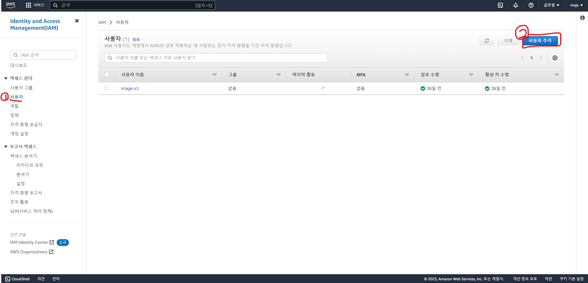 이제 IAM을 만들자 사용자를 들어가서 사용자를 추가하자