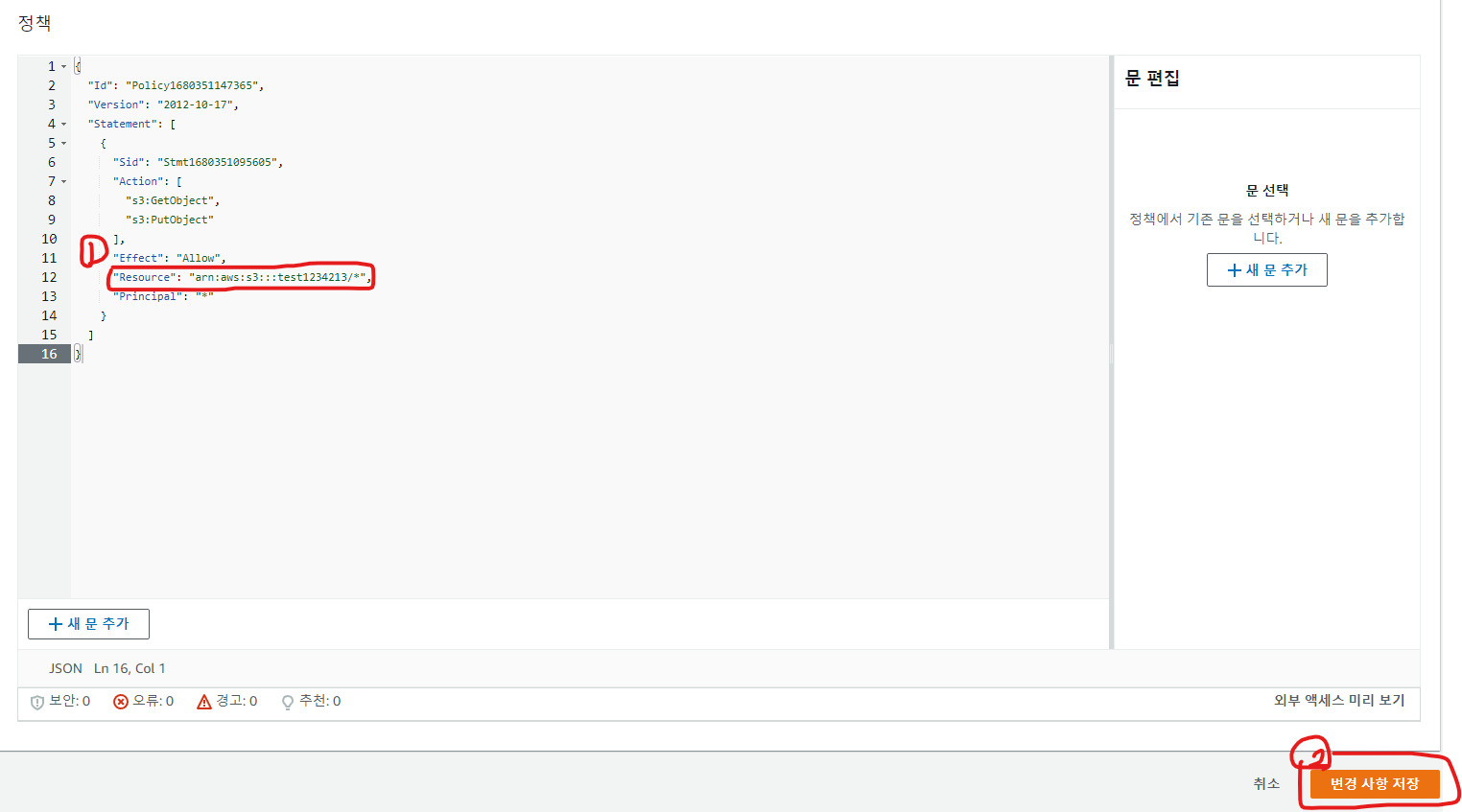 1, 2, 3을 설정하고 4번 Actions에서 PutObject와 GetObject를 선택한다 읽기 권한, 수정 권한을 허용할 수 있게 해 준다