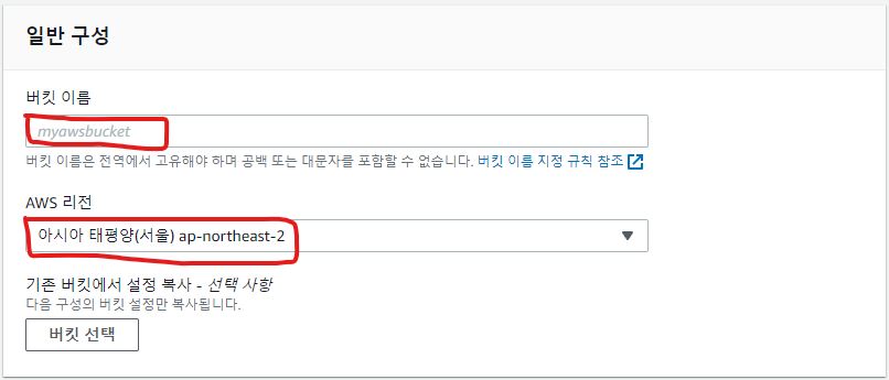 버킷 이름을 지정하고 AWS 리전을 잘 선택하자