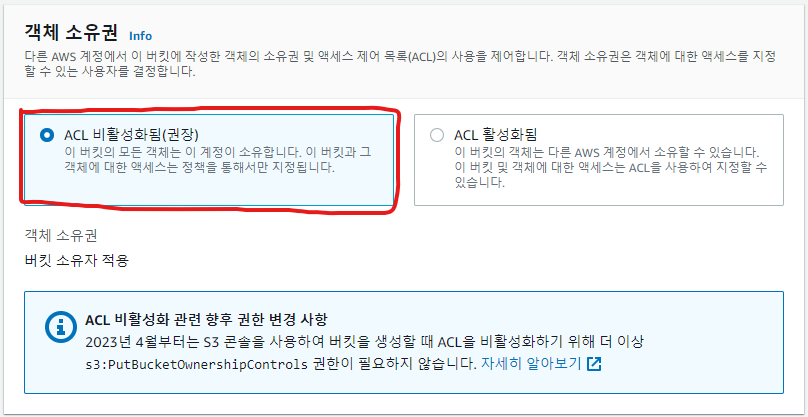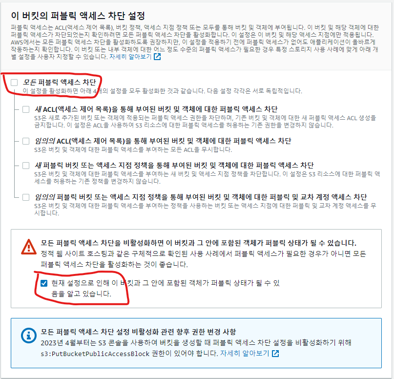 퍼블릭 엑세스 차단을 풀어준다 따로 버킷 정책에서 접근 제한을 걸기 때문에 걱정하지 말자
